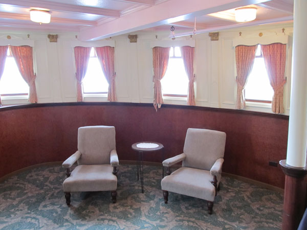 The Entrance: The 3,800-ton vessel carried 288 passengers with a crew of 86. “This would be the main entrance area. The train would pull up right outside these doors, at this very dock, and passengers would come on board and meet with the purser who would tell them what room they were in. He would give them their room key and the chief bellhop would take their bags to their room.”